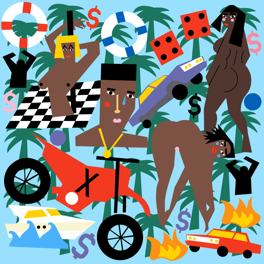 Dollar signs cars dice and Black women in sexually.